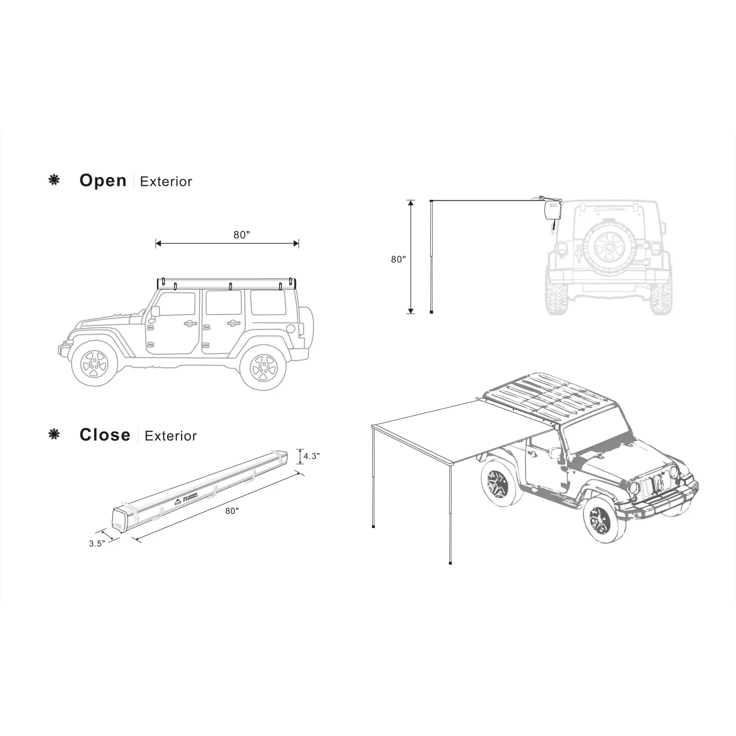 Made from Heavy-Duty RipStop Oxford fabric Material, the no pole car side awning is Waterproof, Tested and Rated to UPF 50+ For Maximum Sun Protection. Canopy Material: (600D Polyester-Cotton(Canvas) PU 1500-2000mm,W/P, W/R). This Car Awning is Available In Left or Right-Hand Models.