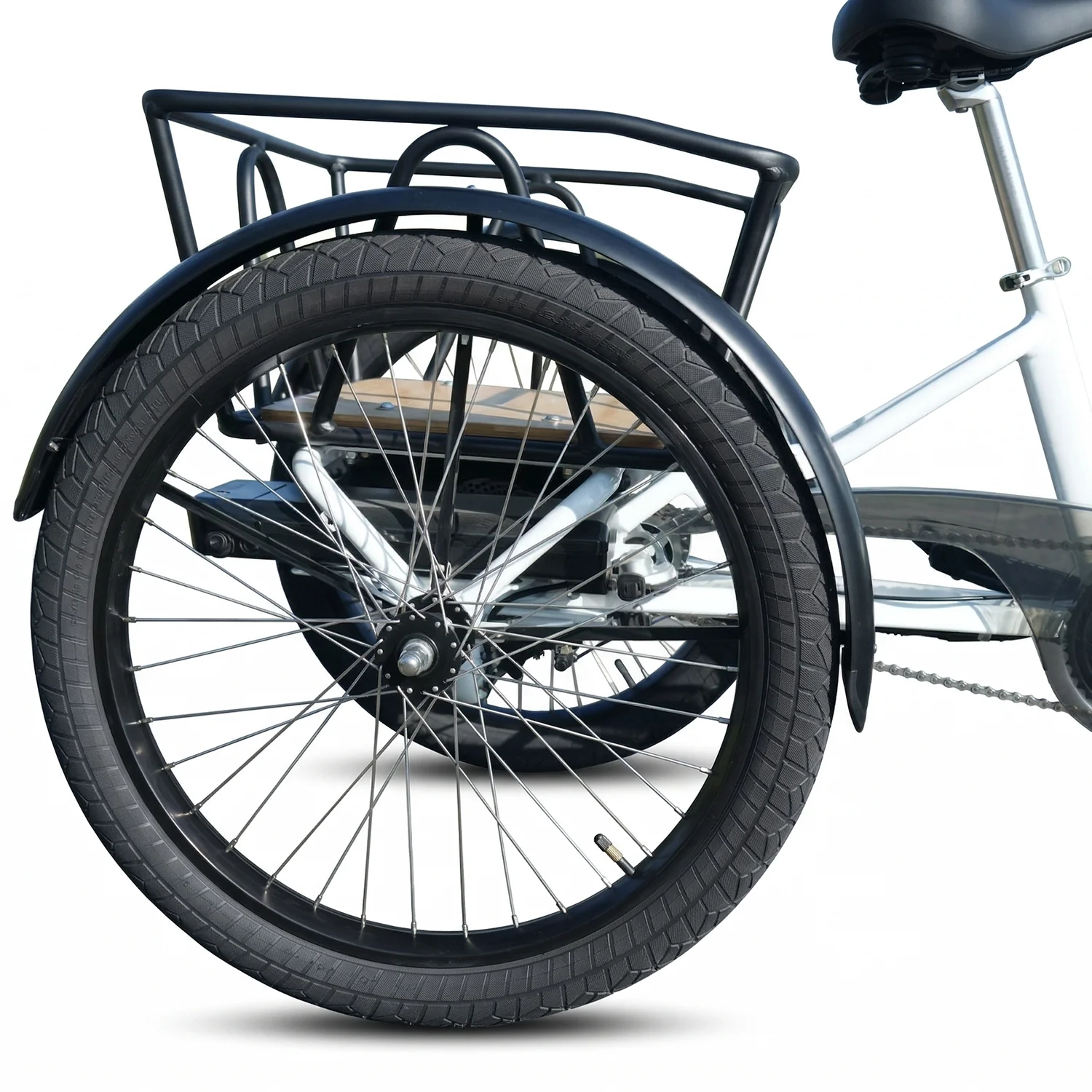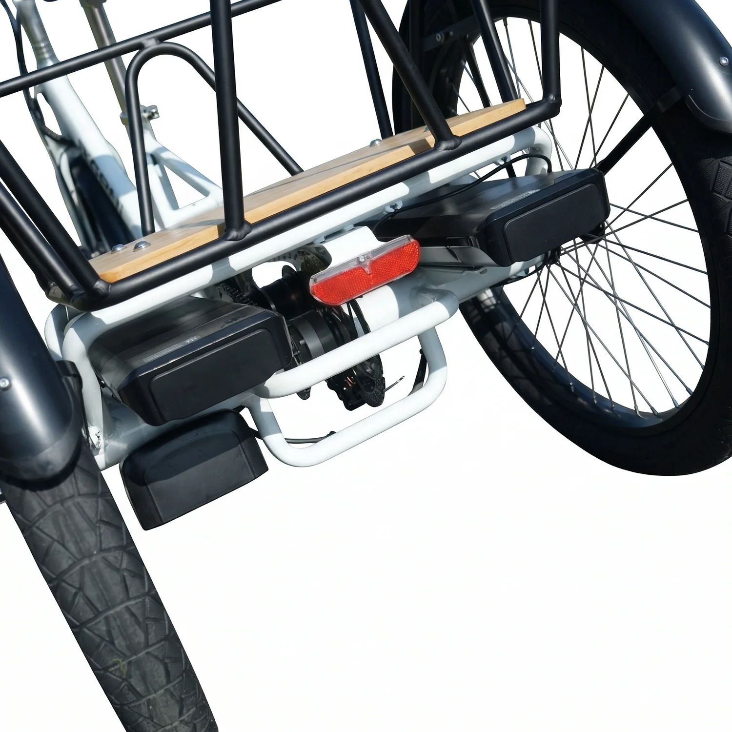 Reinforced Integrated Alloy Cargo Rack The foundation of any great cargo bike is its hauling foundation. The rear rack isn’t just an add-on; it is a heavy-duty, customized black alloy platform engineered to carry substantial weight. Whether you are loading up heavy outdoor gear for an expedition or stacking delivery crates, the rack provides a rigid, sway-free base that maintains the tricycle’s center of gravity.