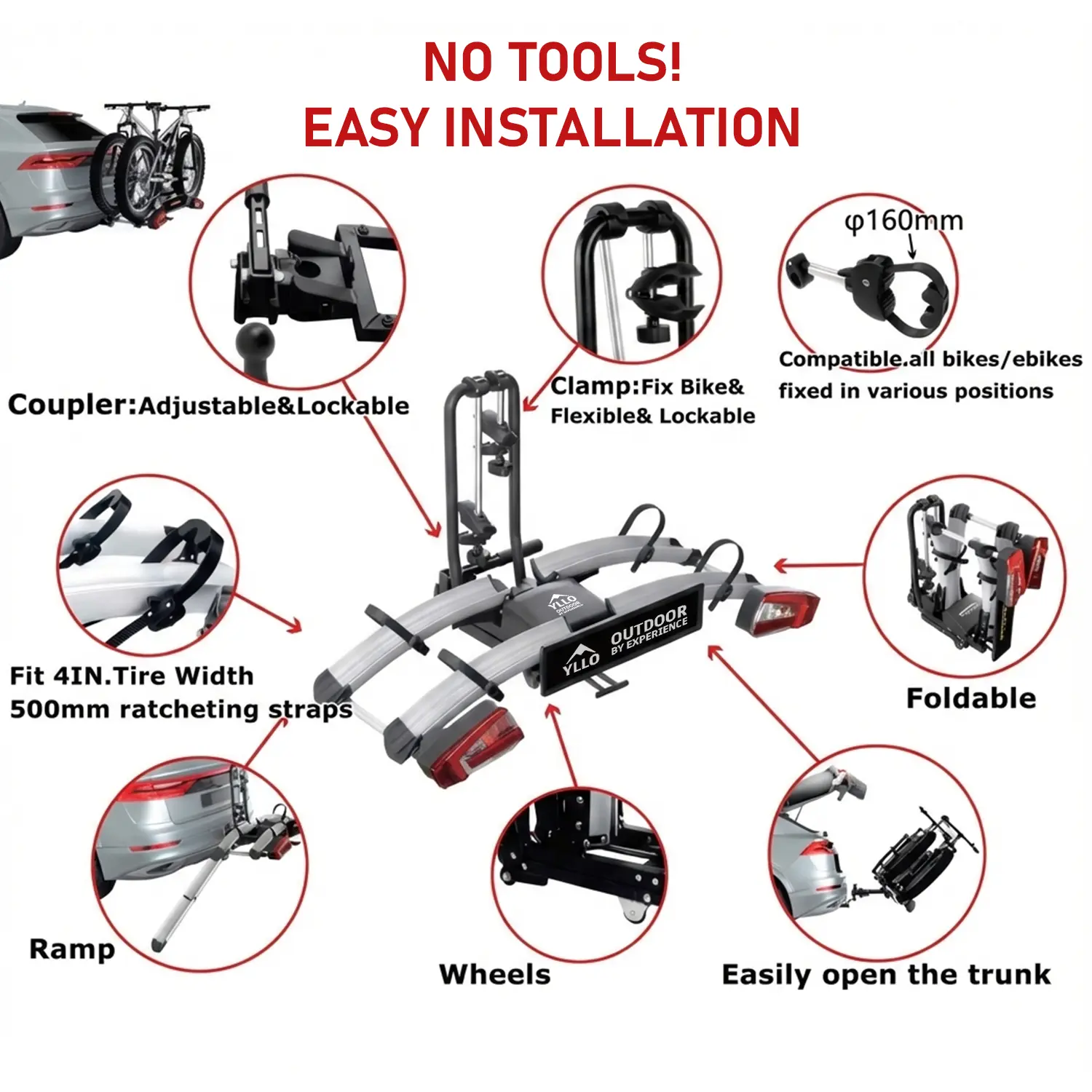 - Adjustable Wheel Holders: Features ratchet straps to firmly secure tires of various sizes (compatible with fat tires).