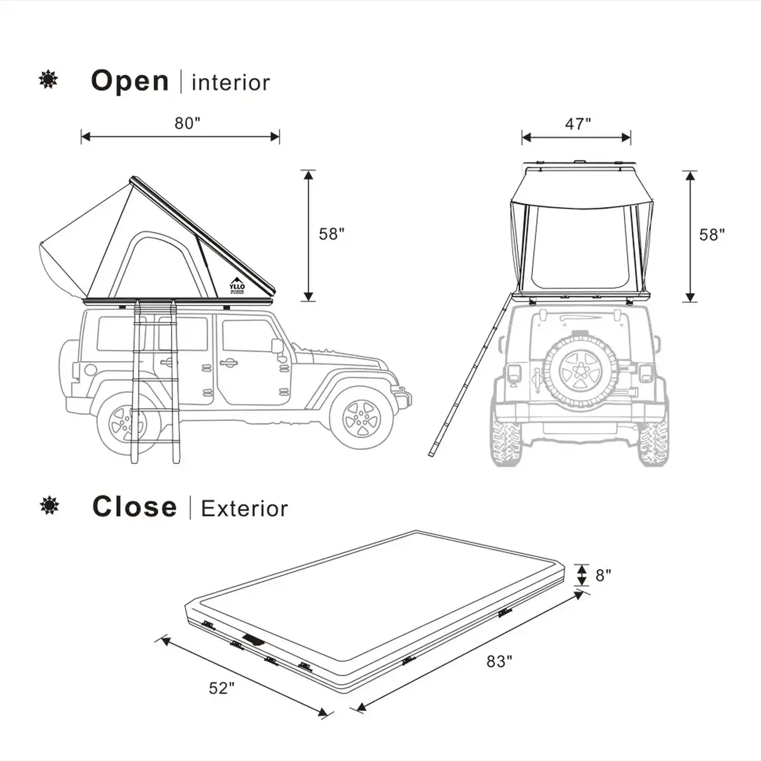 Yllo rooftop tents come in a variety of sizes to fit most vehicles. Our website includes a handy sizing guide to help you choose the perfect tent for your car's roof dimensions and weight capacity.